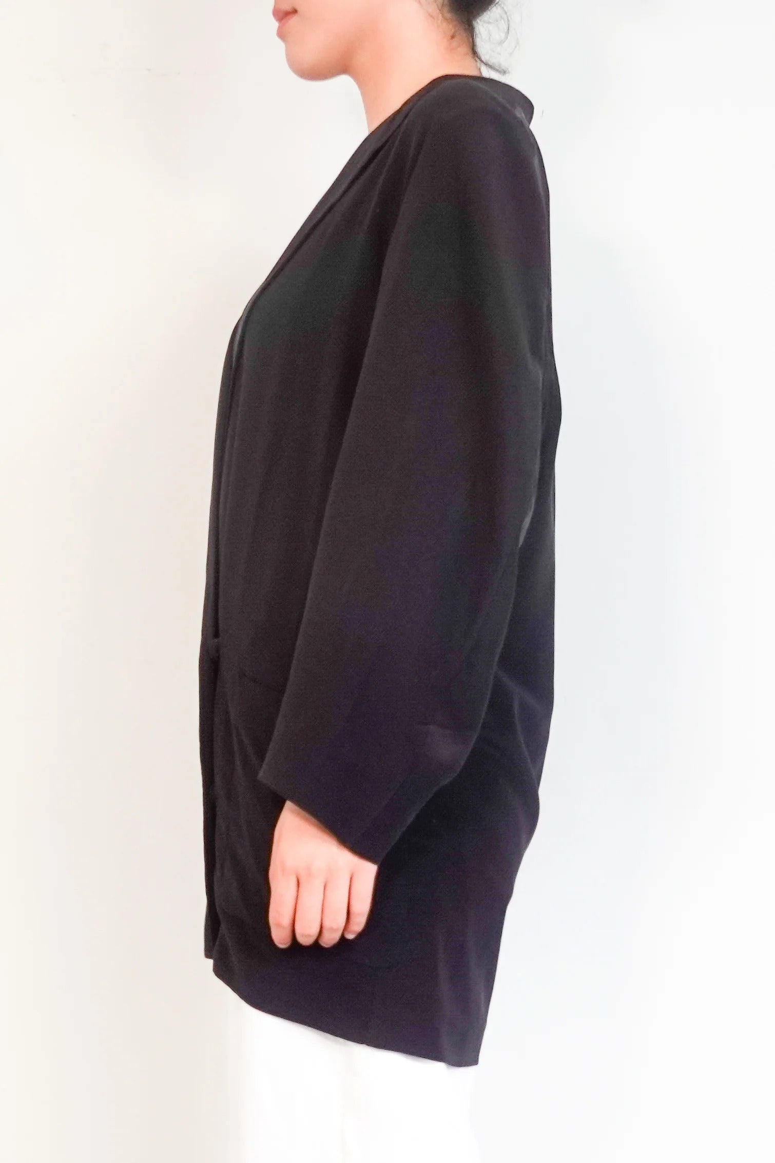 This authentic black silk jacket features a classic collar style and a flattering V-neck. Made from 100% silk, it offers a luxurious feel and elegant look. The jacket includes practical front pockets and a two-button closure for a polished finish. Perfect for adding a sophisticated touch to any outfit.