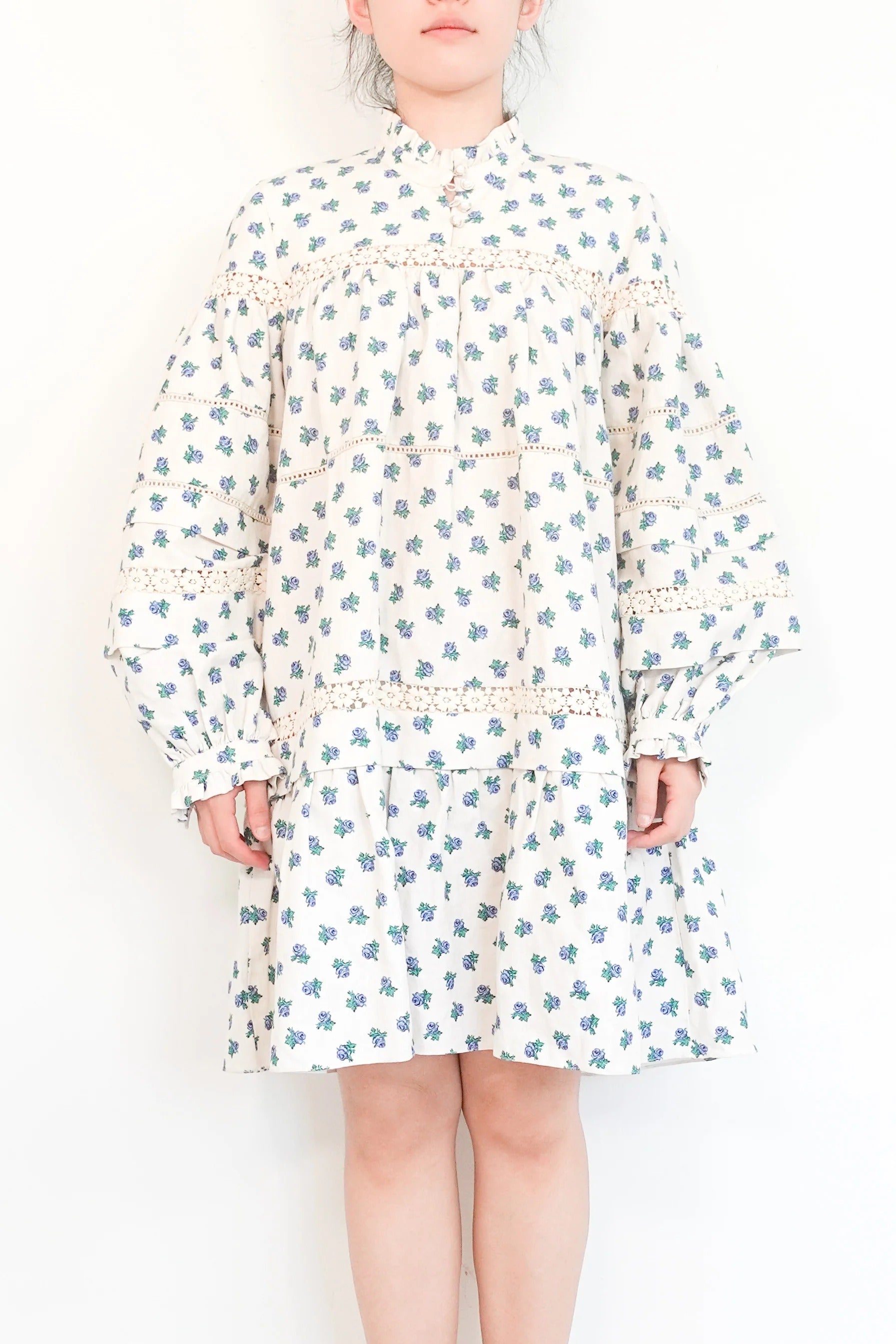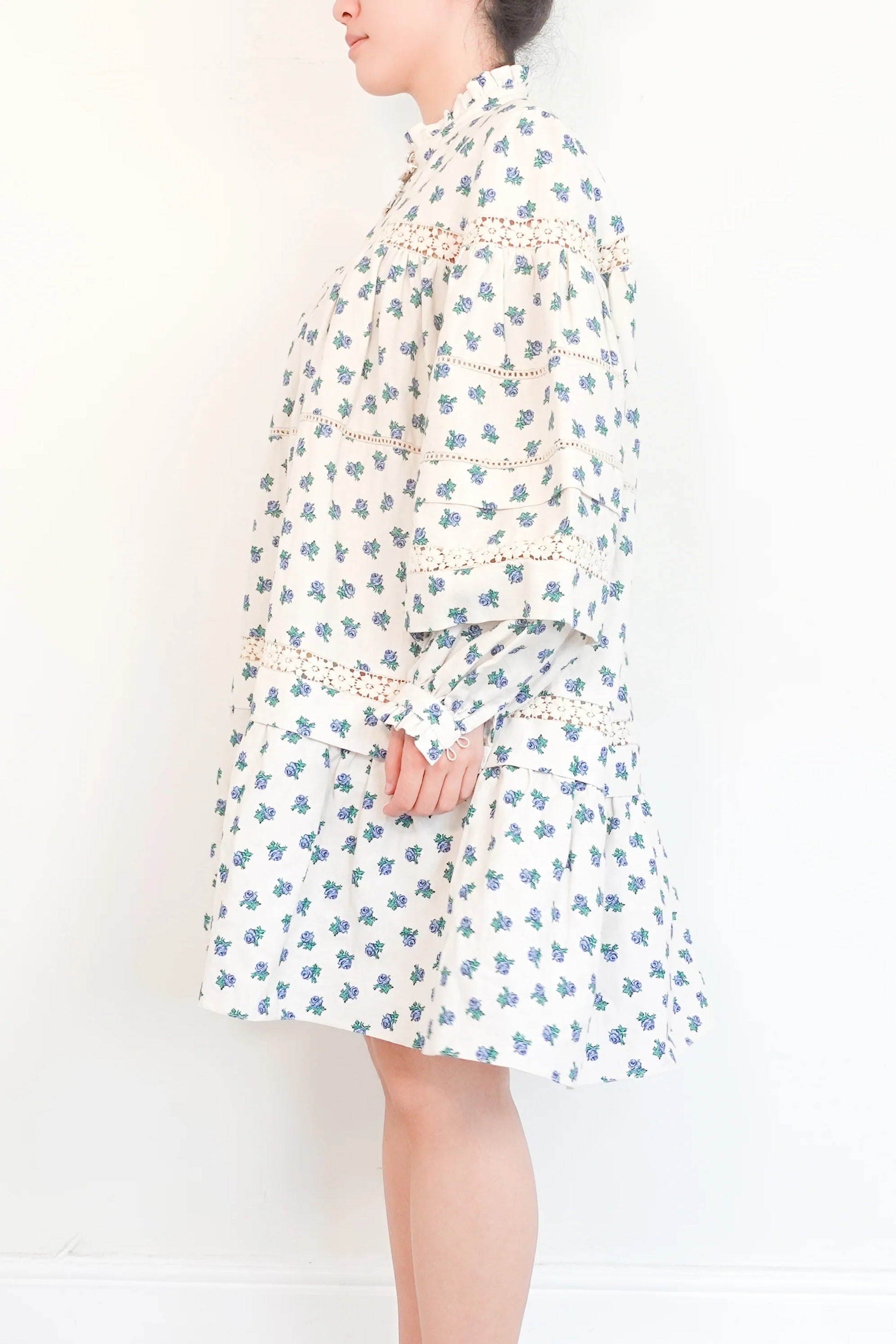 This smock dress features a high neck and a delicate blue flower print. Its pleated design adds subtle texture, while pearl button closures provide an elegant finishing touch. Perfect for a graceful, comfortable look.